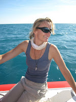 We soon agree we shall go Whale watching, they're passing by on their way South, a great opportunity. A bus picks us up at noon en takes us to the beach. Actually, onto the beach (!) and stops next to a speedboat, on three wheels! Once passengers have boarded, it rides into the water until it's deep enough for the outboard motor to take over. Then the wheels are pulled up and off we go to the big whale watching boat. It takes the little boat 3 turns till all passengers are on board the big boat and then we take off at a speed of about 55 Km/h towards the whales.